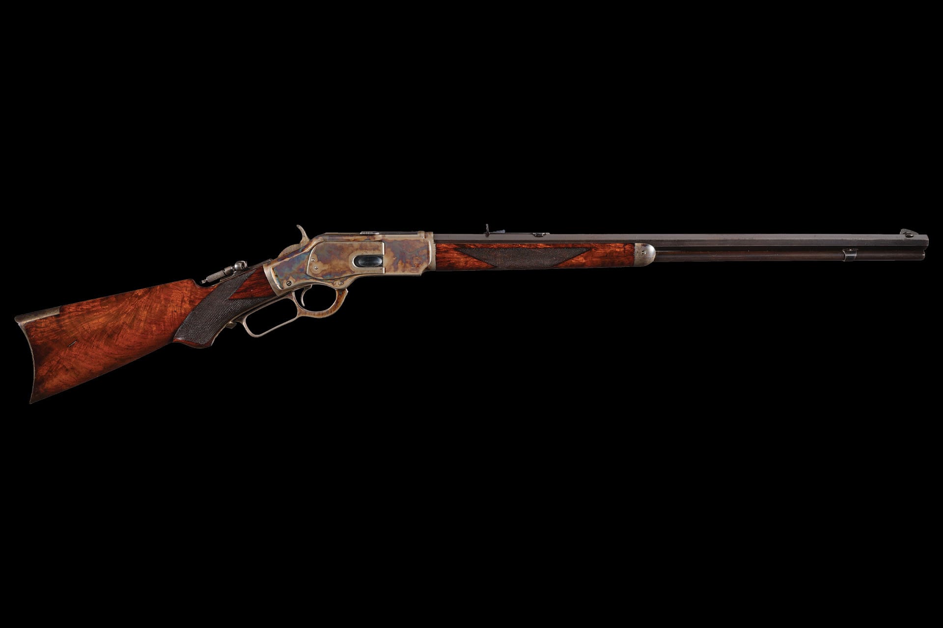Very fine, retains 80% of the slightly thinned original blue finish, 90% of the vibrant original case colors, and 85% of the original nitre blue on the loading gate with the balance mostly a smooth grey patina and a few scattered, very small patches of light surface spotting. The wood is fine with scattered minor dings and scratches, a few light edge chips, a revarnished repair at the toe, and crisp checkering apart from a few scattered minor blemishes. Mechanically excellent. A very fine example of a special ordered Winchester deluxe Model 1873 that would be an exceptional addition to your collection!