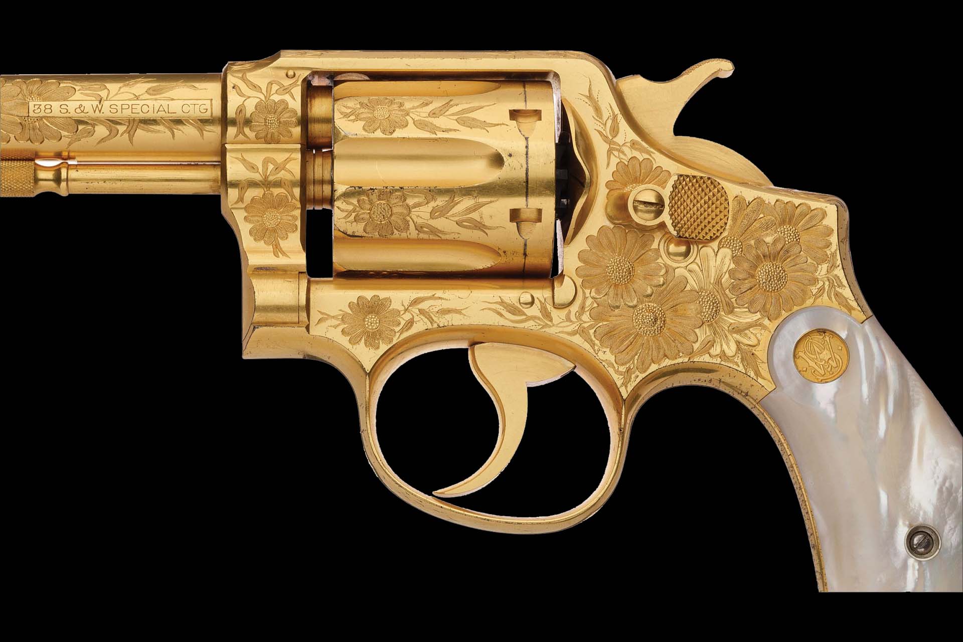 Factory engraved in a highly unusual floral pattern, this .38 Military & Police First Model Double Action revolver is regarded by collectors and engraving scholars as one of Oscar Young’s true masterpieces. Oscar Young, son of the famed master engraver Gustave Young, began engraving for Smith & Wesson in the early-to-mid 1880s and succeeded his father as the company’s master engraver in 1895. Working alongside his brother Eugene, he continued the family’s engraving legacy at S&W until his death in 1912. This revolver’s embellishment was completed in late 1900 in preparation for exhibition at the 1901 Pan-American Exposition, where it was awarded the Gold Medal for Revolvers.
