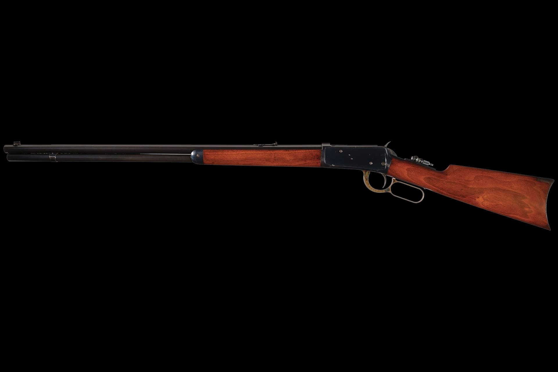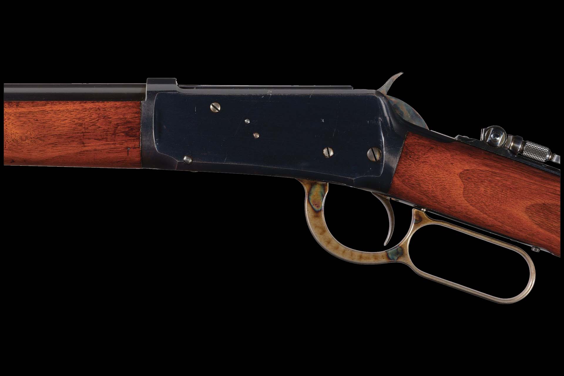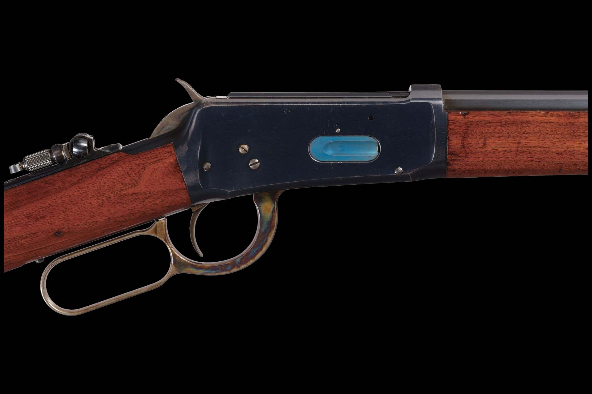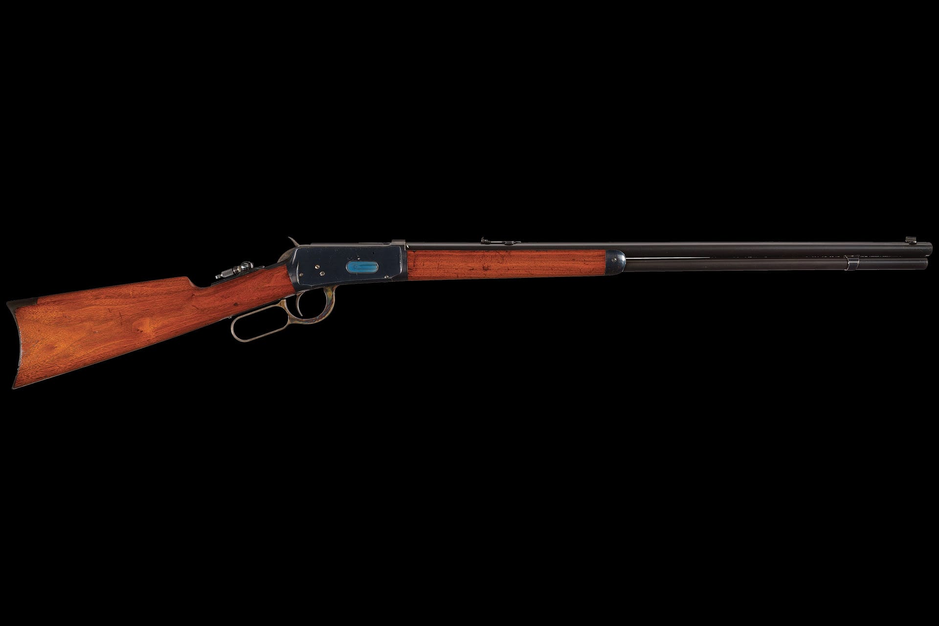 Exceptional overall condition, retaining over 97% of the brilliant original high-polish blue finish, 95% of the vivid case colors, and 98% of the original niter blue on the loading gate. The balance displays a smooth gray patina, concentrated primarily on the buttplate, with only the most minor, scattered surface marks along the upper left receiver edge. The select walnut stock and forearm remain excellent, showing only a few insignificant storage dings and faint handling marks. Mechanically flawless. This is unquestionably among the finest antique Model 1894 examples we have ever had the privilege to offer at auction.