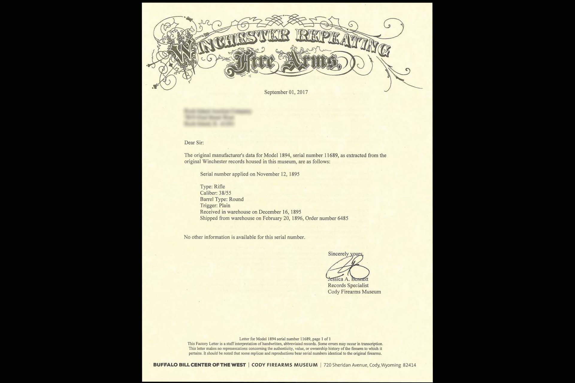 An outstanding example of a standard configuration Winchester Model 1894 rifle, manufactured in 1895—only the second year of production. Chambered in desirable .38-55 W.C.F., this rifle features standard two-line barrel address and caliber markings, three-leaf express rear sight, dovetailed beaded front sight, and tang peep sight. The included factory letter confirms the rifle’s configuration and serial number application date of November 12, 1895, warehouse receipt on December 16, 1895, and shipment on February 20, 1896.