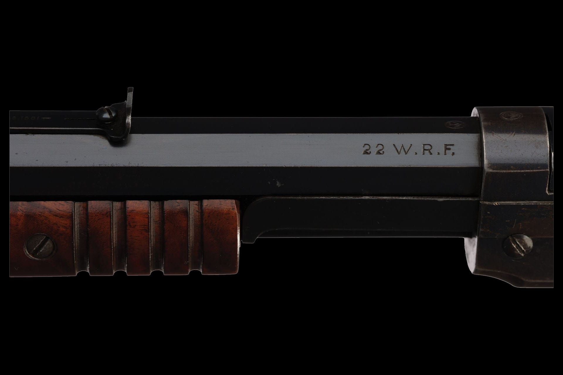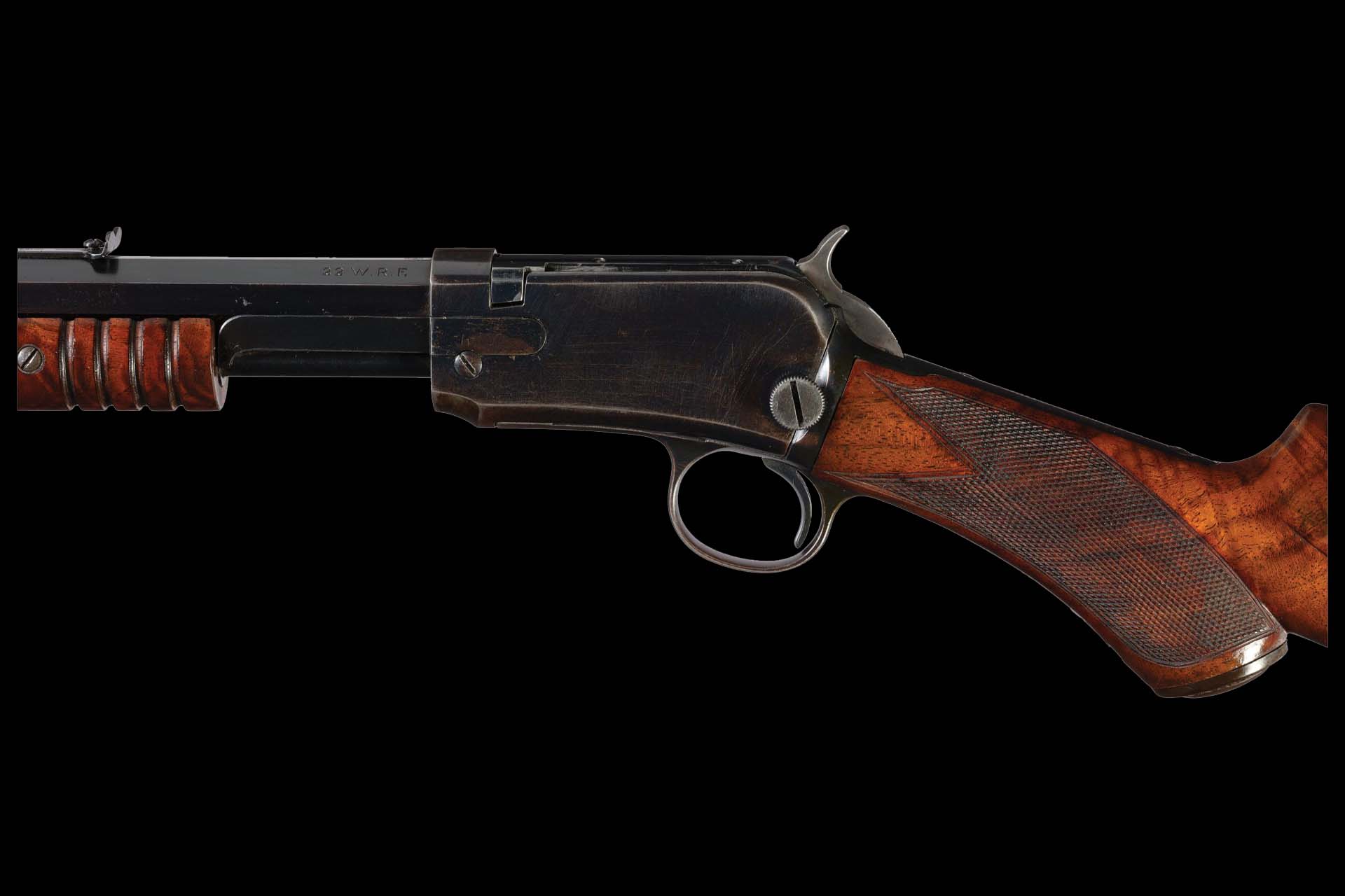 Manufactured in 1910, this deluxe Winchester Model 1890 is chambered in the highly desirable .22 W.R.F. The rifle features a dovetail blade front sight and an elevation-adjustable notch rear sight. The barrel is marked on the upper left flat with the two-line address and patent dates, followed by “-MOD. 1890-” and the caliber designation “22 W.R.F.” at the breech. Factory oval proofs are stamped on the barrel and receiver at the breech, with the caliber designation “WRF” also stamped on the front of the receiver.