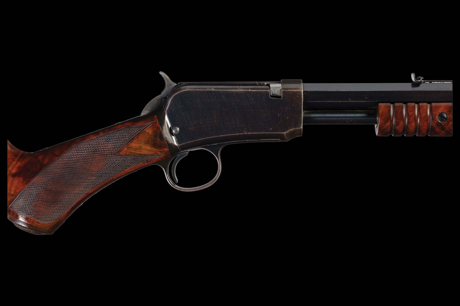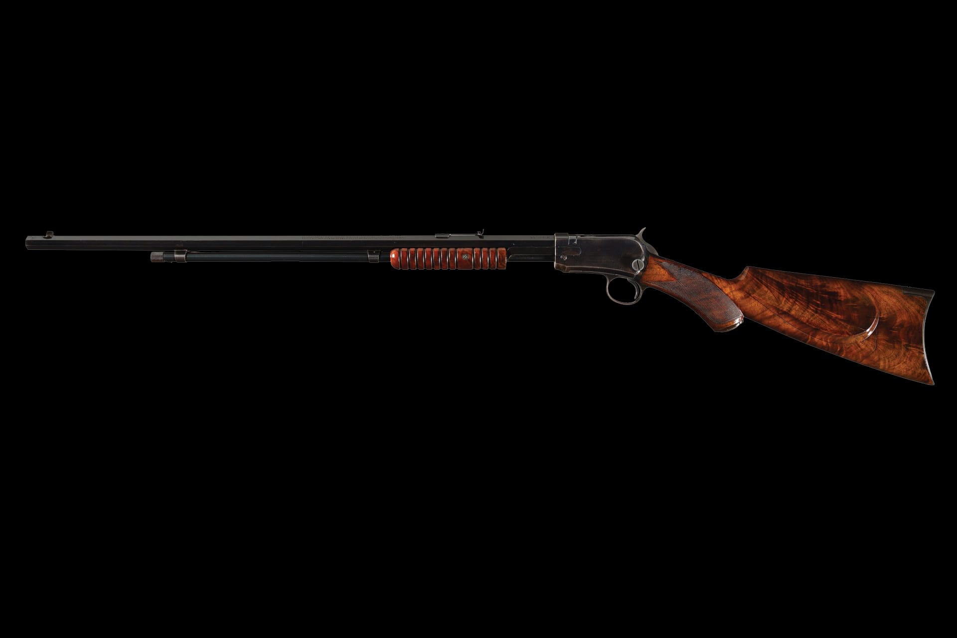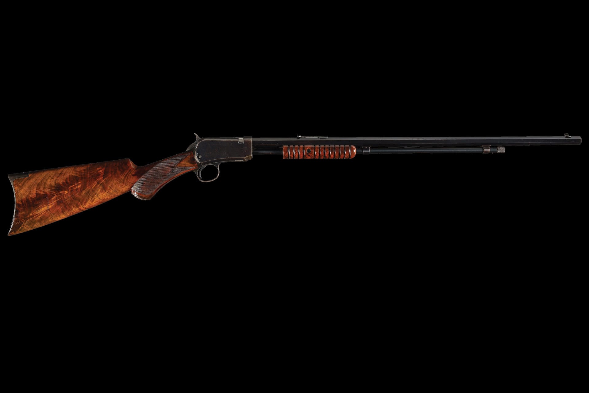 The rifle is fitted with a highly figured deluxe 12-groove slide handle and a checkered pistol grip stock featuring an unusual left-side cheekpiece, a hard rubber Winchester grip cap, and a crescent steel buttplate.