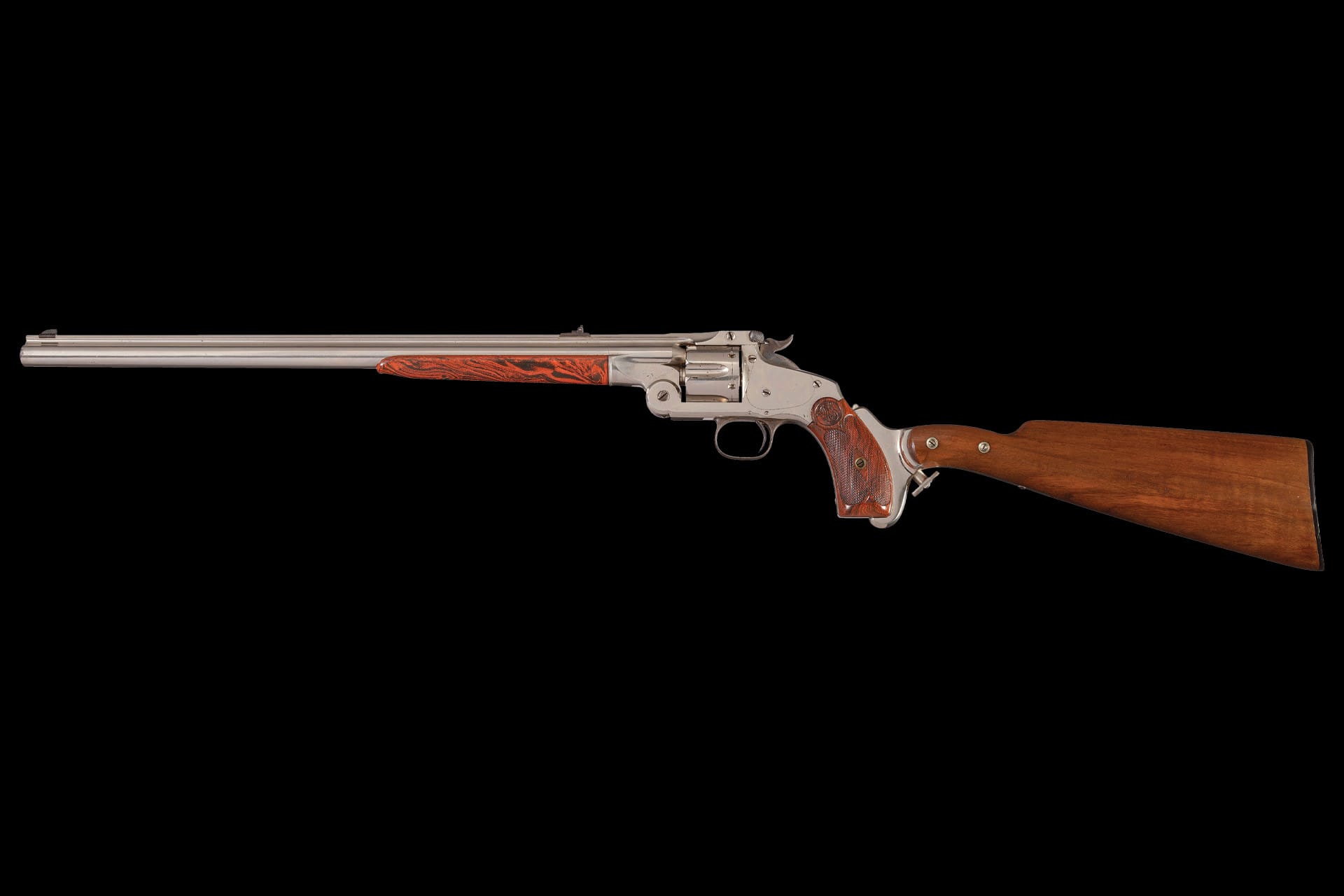 Manufactured from 1879 to 1887, the Smith & Wesson Model 320 Revolving Rifle is one of the rarest firearms produced by the company, with a total production of just 977 examples. Built on the frame, cylinder, and basic action of the New Model No. 3 revolver, the Model 320 featured minor modifications to the hammer and trigger and a two-piece barrel design. The butt is slotted and the back strap drilled to accommodate the tang-style shoulder stock.
