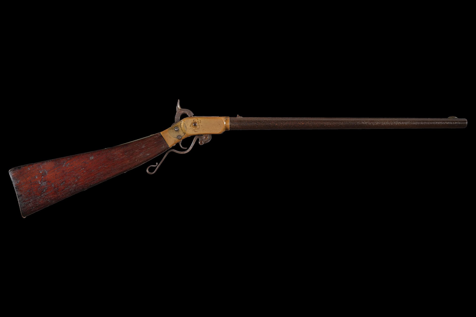 This breech-loading cavalry carbine is one of a reported 282 believed to have been manufactured by Keen, Walker & Company of Danville, Virginia, between May and September of 1862 for use by the Confederacy during the Civil War, according to pages 151-152 of “Confederate Carbines & Musketoons” (2002) by John M. Murphy and Howard Michael Madaus. Only a small number of surviving examples are known today. According to “Confederate Arms” by Albaugh and Simmons, these carbines were believed to have been designed by inventor N. T. Read under a Confederate patent (possibly number 154, granted March 20, 1863), although page 151 of “Confederate Carbines & Musketoons” states that the authors disagree and it remains a subject of debate. I was unable to locate any further information or an illustration of the patent in question. The breech block mechanism resembles that of the Hall rifles and carbines, as well as the Perry carbine, and the carbine itself shows only slight visual similarities to the Maynard carbines. Consequently, “Flayderman’s Guide” refers to these as a “Maynard or Perry Brass Frame Carbine” (9th Edition, 10-039). The frame of these carbines has since been identified as made of bronze rather than brass, based on an invoice from the Confederate States to Keen, Walker & Company dated July 8, 1862, for “4,940 lbs of bronze-$1,976.” They feature a blade front sight, notch rear sight, seven-groove rifling, a sling bar and ring mounted on the left side of the frame, a Maynard-style buttstock, and an iron buttplate. No visible markings are present on the outside of the carbine, but a Roman numeral assembly number “XXVI” is carved into the concealed area of the upper tang and in the upper stock channel. Other examples of these carbines have been known to bear similar Roman numeral markings. Relevant details about these carbines and other pictured examples can be found on pages 151-157 of “Confederate Carbines & Musketoons” (2002) by Murphy and Madaus. The consignor indicated this carbine was purchased from Dave Taylor on September 12, 2020. Provenance: Dave Taylor; Private Collection.
