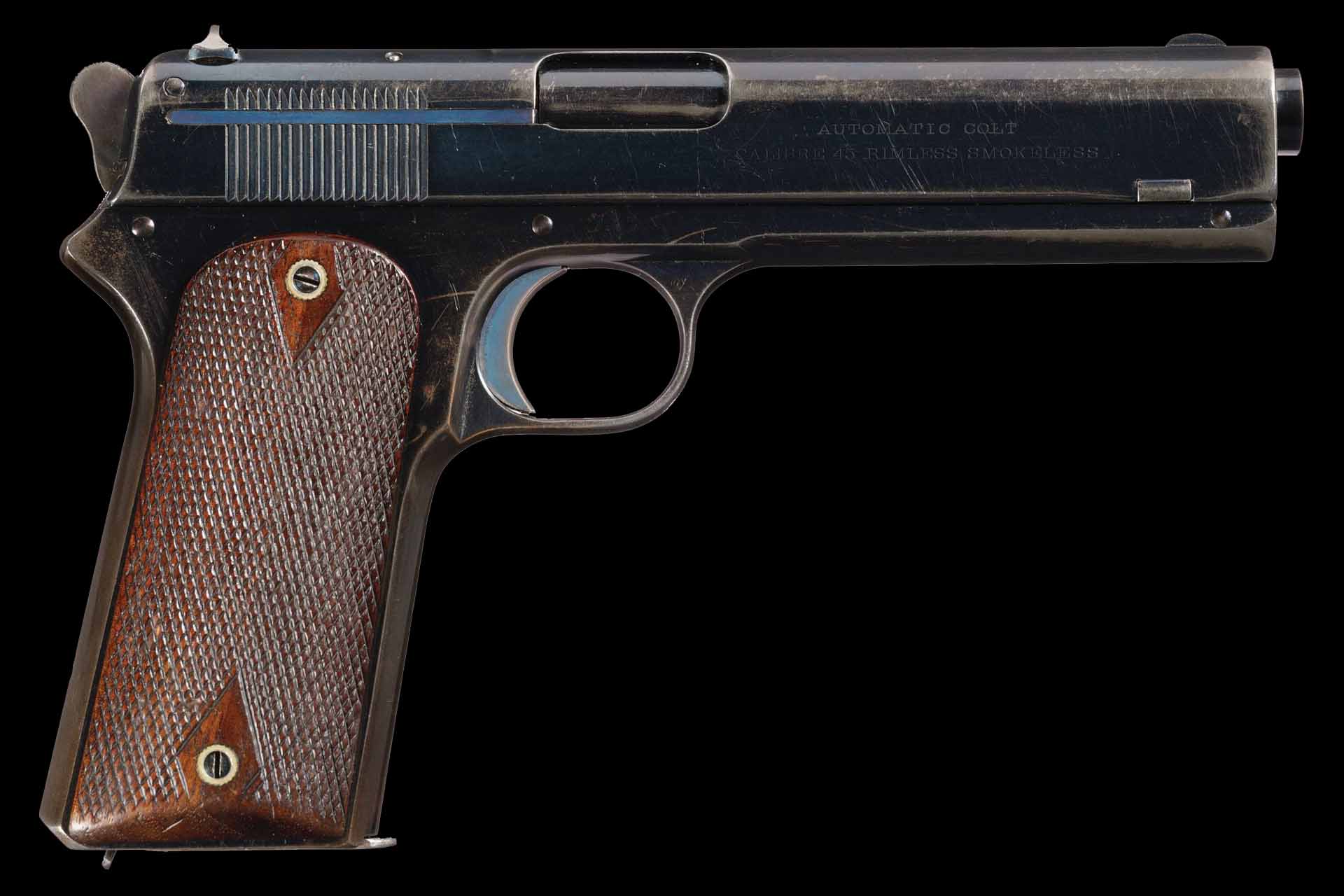 Manufactured in 1906, this pistol is one of approximately 6,100 Model 1905 pistols made by Colt between 1905 and 1911, marking the first pistols chambered for the now legendary .45 Colt Automatic Pistol (ACP) cartridge. It features fixed, rounded blade front and notch rear sights, a checkered round spur “stub” hammer with a half-cock notch, a checkered slide catch, an exposed extractor, and an early brass firing pin. The slide displays the two-block, two-line patent information along with the Colt address, with “AUTOMATIC COLT/CALIBRE 45 RIMLESS SMOKELESS” on the right side. The left of the trigger guard bears the “VP” triangle and “W” sub-inspector proofs, with the serial number on the left side of the frame. It is fitted with a pair of diamond-pattern checkered walnut grips. Provenance: The Thomas Whiteman Collection.