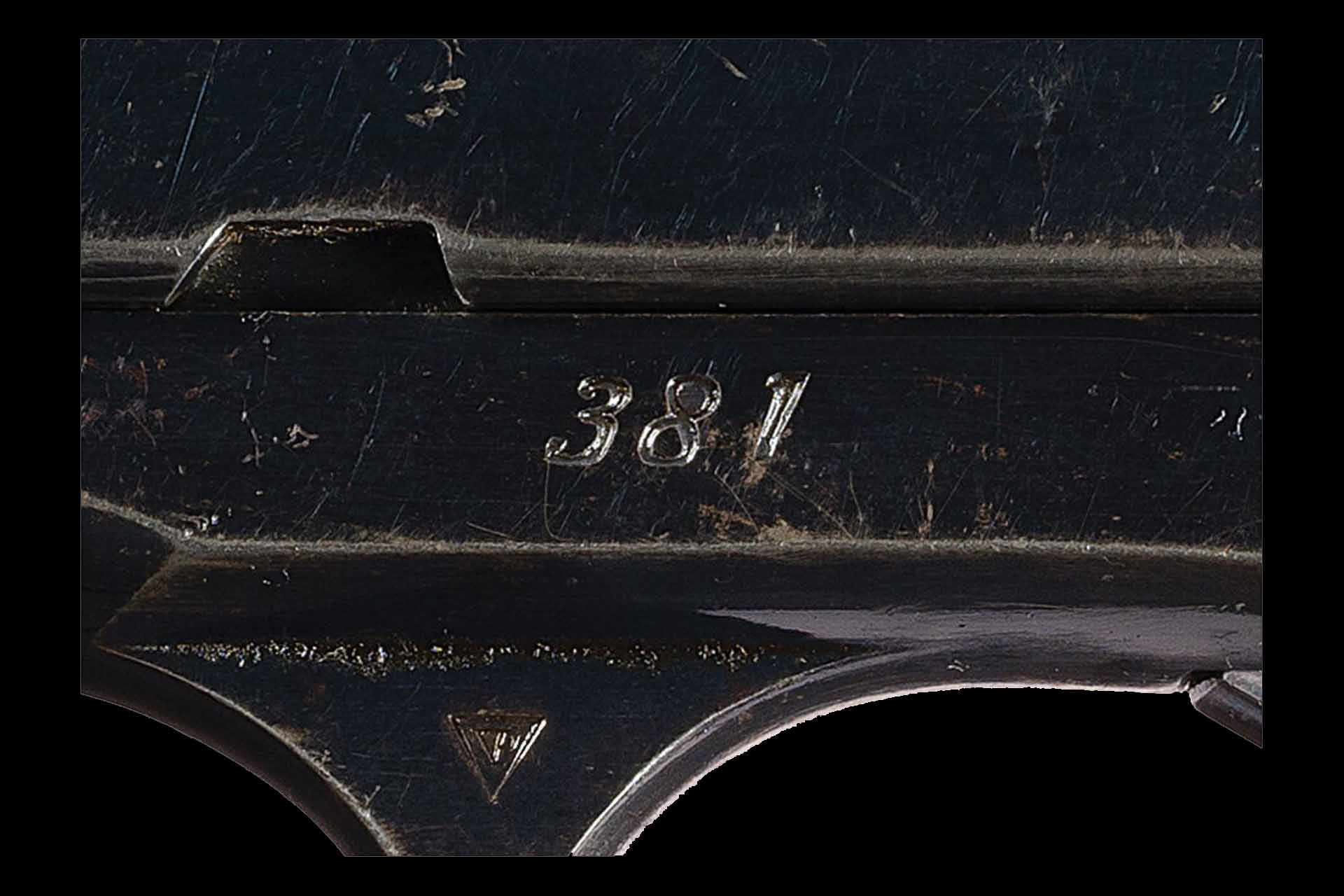 Manufactured in 1906, this pistol is one of approximately 6,100 Model 1905 pistols made by Colt between 1905 and 1911, marking the first pistols chambered for the now legendary .45 Colt Automatic Pistol (ACP) cartridge. It features fixed, rounded blade front and notch rear sights, a checkered round spur “stub” hammer with a half-cock notch, a checkered slide catch, an exposed extractor, and an early brass firing pin. The slide displays the two-block, two-line patent information along with the Colt address, with “AUTOMATIC COLT/CALIBRE 45 RIMLESS SMOKELESS” on the right side. The left of the trigger guard bears the “VP” triangle and “W” sub-inspector proofs, with the serial number on the left side of the frame. It is fitted with a pair of diamond-pattern checkered walnut grips. Provenance: The Thomas Whiteman Collection.