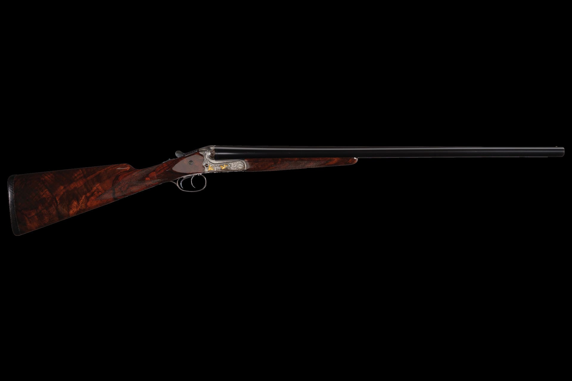 The gun features bushed firing pins, cocking indicators, double triggers, and a tang-mounted automatic safety. It is fitted with a beautifully figured, multi-point checkered forend with engraved forend iron and a straight grip stock with leather-covered recoil pad.