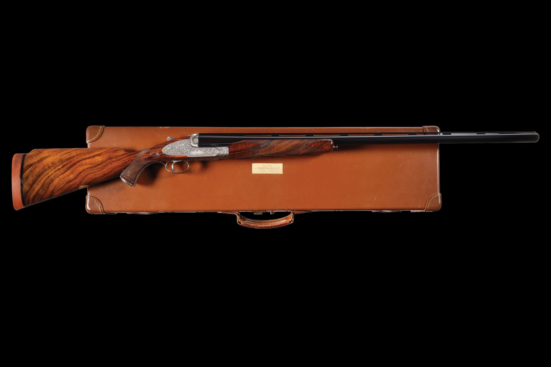 Built with a blued steel barrel featuring dual white bead sights on the matted vent rib, signed “J. PURDEY & SONS. AUDLEY HOUSE. SOUTH AUDLEY STREET. LONDON. ENGLAND.” on the left side. The barrel displays a single band of engraving at the breech, period London proof marks on the flats, and 2 3/4 inch chambers with an extractor. It is fitted to a sleek brushed bright Beesley-type self-opening sidelock action with a false sideplate on the right and a bushed firing pin.