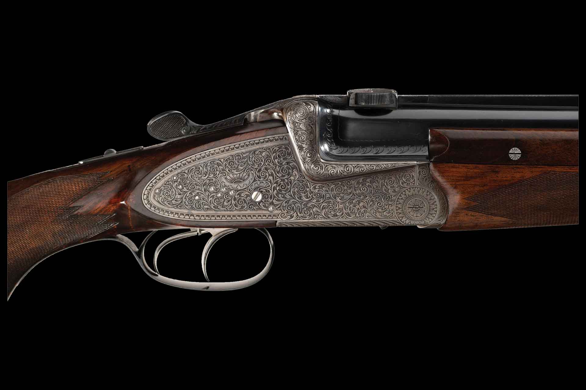 It is fitted with a highly figured, multi-point checkered three-piece forend with engraved fittings and a round-knob pistol grip stock with left-handed shadowline cheekpiece, engraved blued-steel cartridge trap with gold-inlaid “PB,” and red rubber recoil pad.