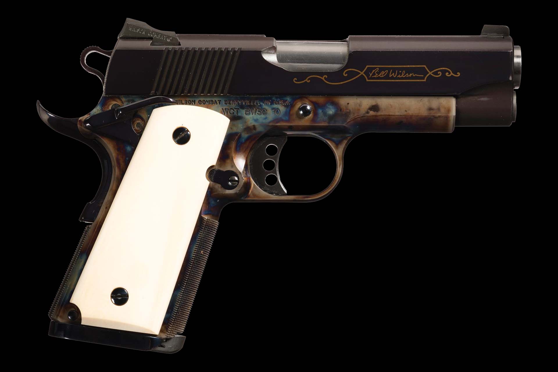 Manufactured in Berryville, Arkansas, c. 2006 as one of 50 Bill Wilson Signatures Series limited edition three pistol sets (consisting of full-size, commander, and compact sizes), with this specific pistol being the compact size pistol of set number 10. Features Tritium insert bade front and Wilson Combat notch rear sights. The left of the contrasting matte and gloss blue finished slide is gold inlaid on the left with the Wilson Combat logo along with “10 OF 50” behind the serrations, and Bill Wilson’s signature gold inlaid on the right side. The frame features a case-hardened finish by Turnbull Restoration. Fitted with a pair of smooth ivory grips and a stainless steel magazine. Includes a lockable Bill Wilson signature Wilson Combat walnut display case fitted to the pistol, a grey Wilson Combat soft case, five extra stainless steel magazines, and a spare set of ‘double-diamond’ checkered fancy grain walnut grips with Wilson Combat medallion inserts. The other two number “10 OF 50” Bill Wilson Signatures Series pistols from the set are in the following lots.