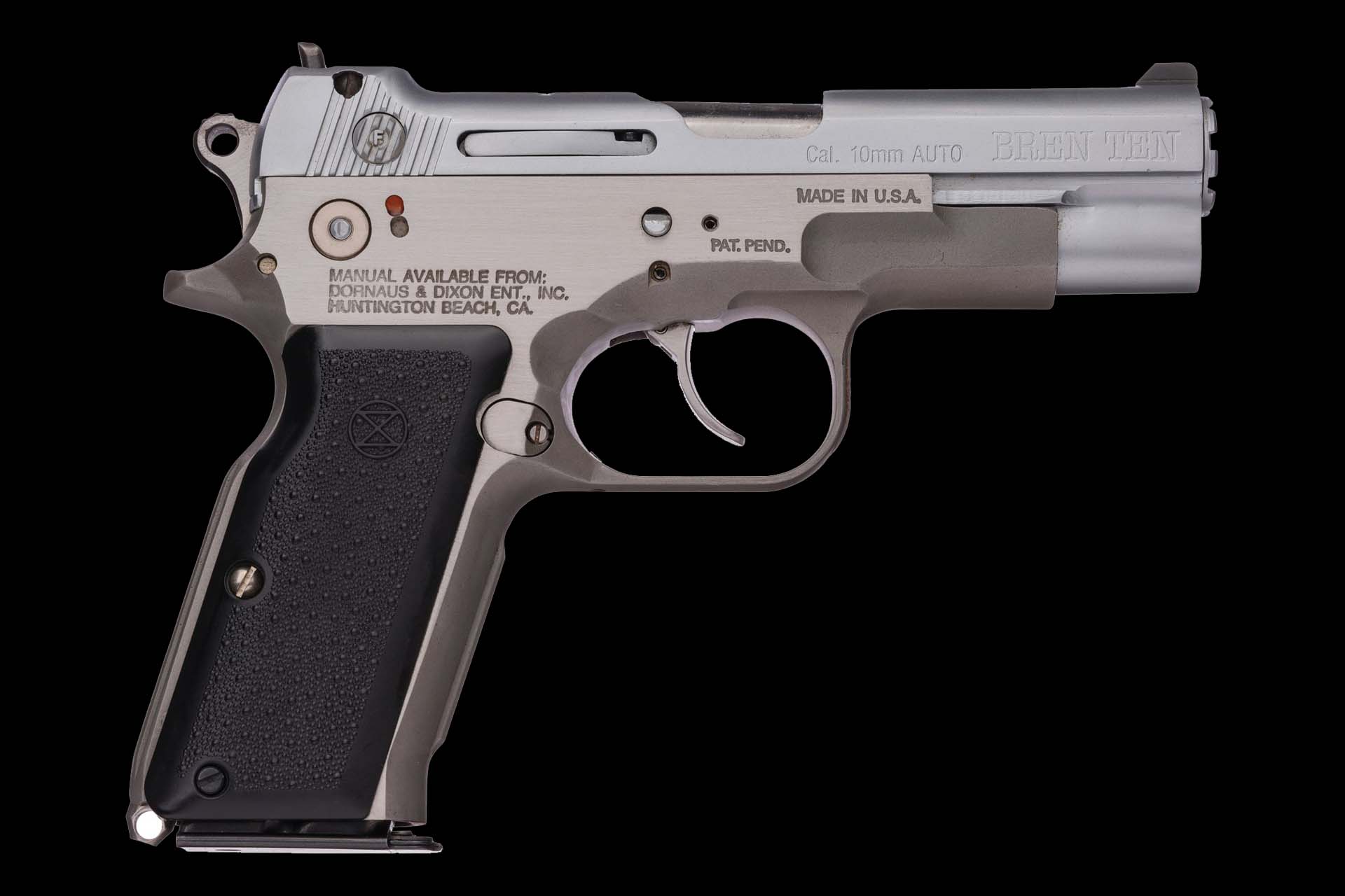 Manufactured c. 1984, the ‘Special Forces’ version of the Dornaus & Dixon Enterprises Inc. Bren Ten semi-automatic pistol was a part of a limited production run with a shorter 4 inch barrel and appropriately shortened slide. There was also a sub-configuration of this limited run called the ‘Special Forces Light’ that features a hard chrome plated slide, with an estimated production total of just 75 to include this example. While the use of a chromed slide Bren Ten by Don Johnson in Miami Vice is what put the Bren Ten on the map, most examples of chromed slides are the result of custom work, with the Special Forces Light being the only known version to leave the factory with this desirable feature. Features fixed white-dot blade front and adjustable white-dot notch rear sights, hard chrome plated slide, slide catch, and thumb safety, a “S” and “F” marked push-button safety in the slide under the rear sight, along with a polished finish on the sides of the frame contrasted with a matte finish on the ventral lines. The left of the slide is marked with “BREN TEN” and “SPECIAL FORCES”, with the caliber and repeated model marking on the right side. The frame bears the serial number and “Jeff Cooper Raven” on the left side, with the Dornaus & Dixon Ent. inc. address and “PAT. PEND.” marked on the right. Fitted with a pair of textured black polymer grips with the distinct “circled hourglass” Bren Ten logos.