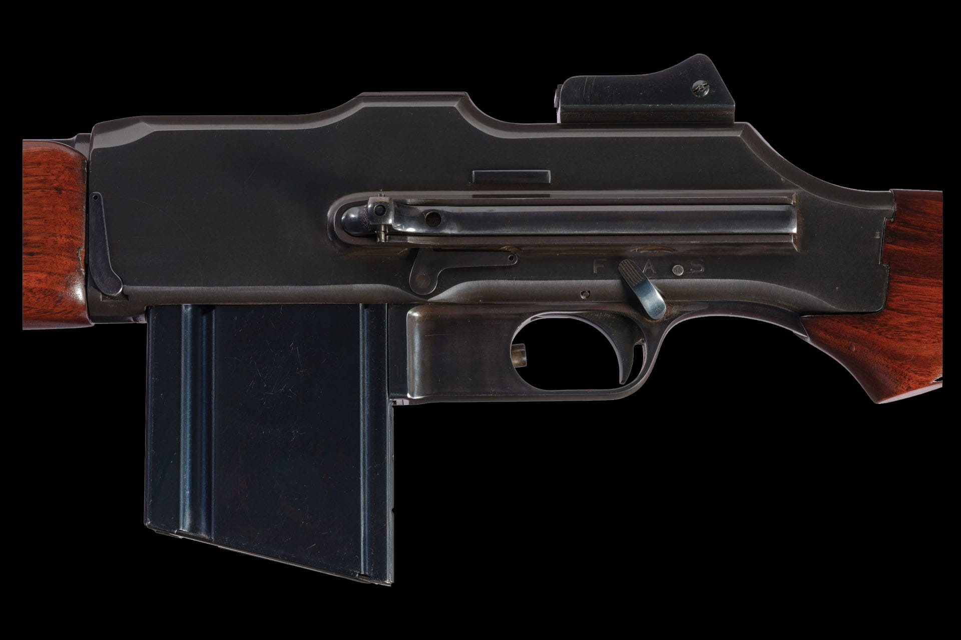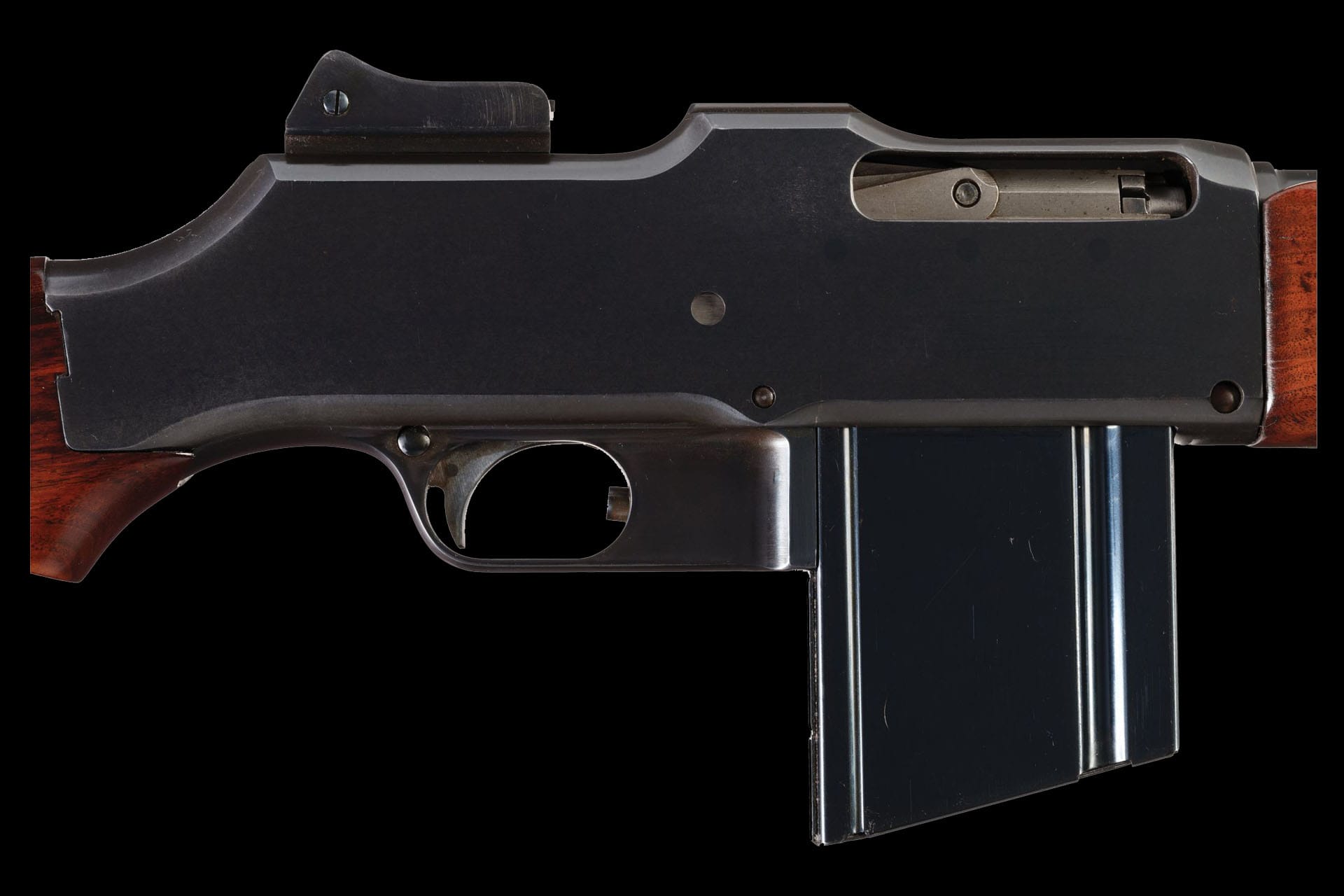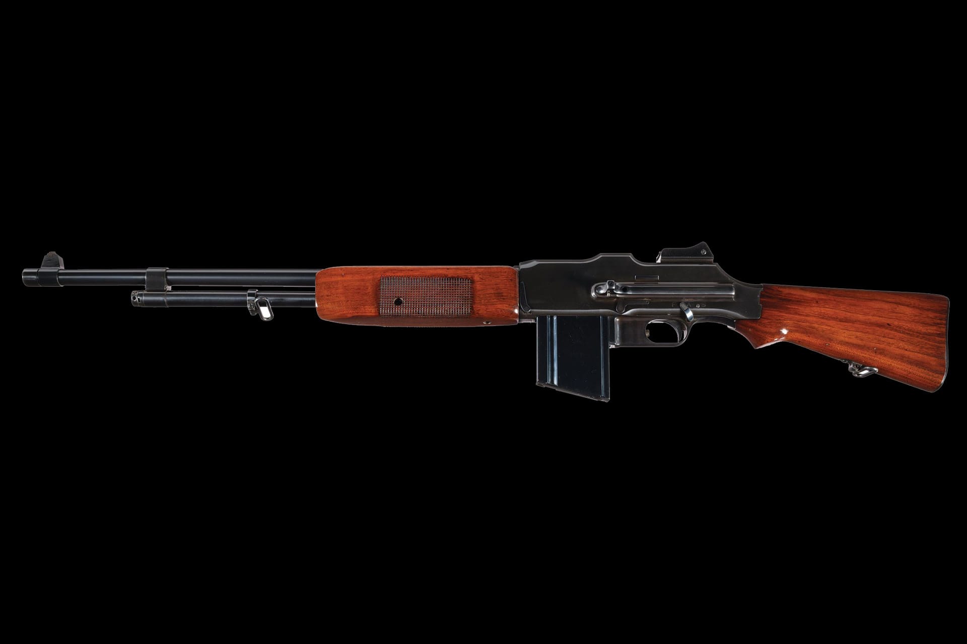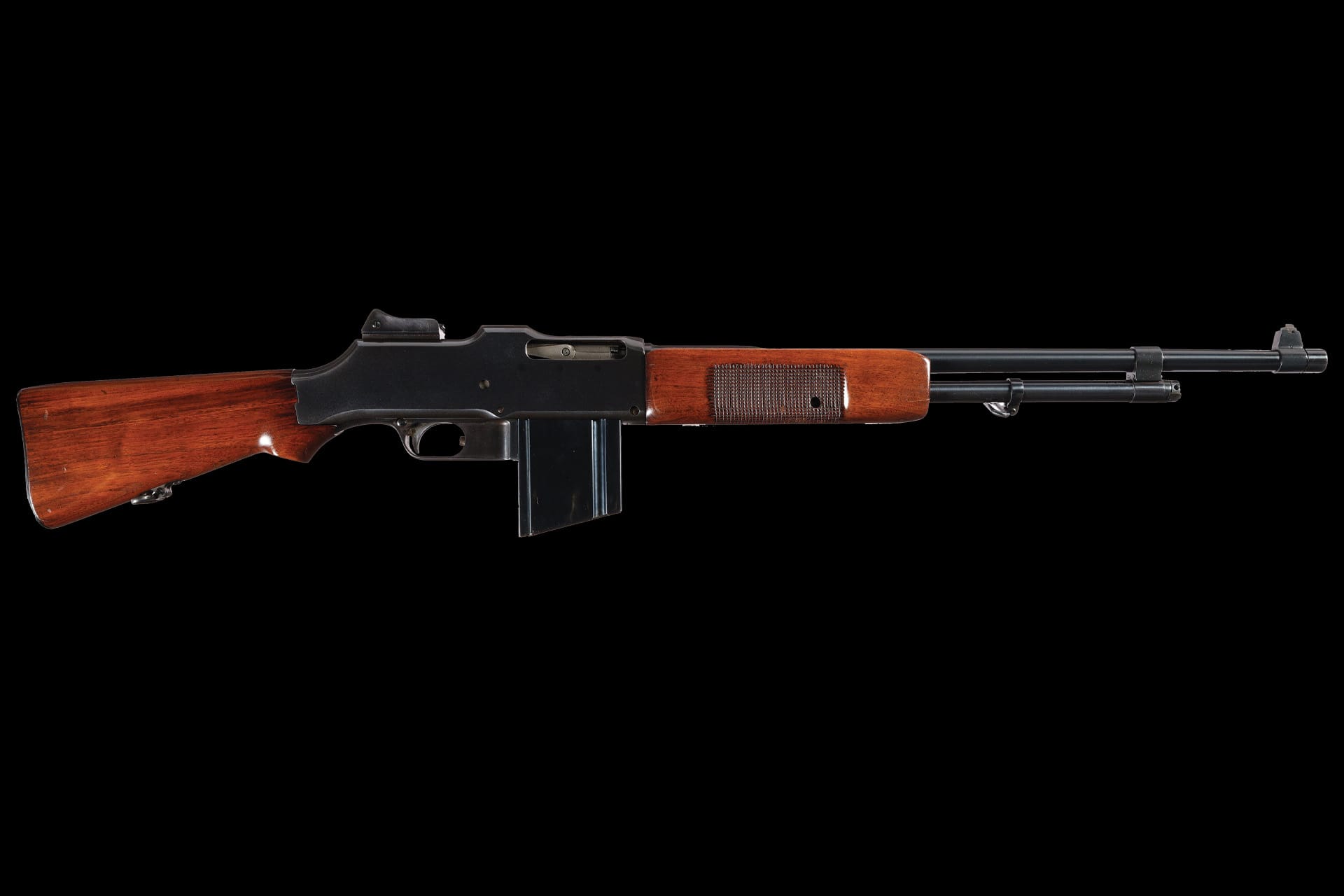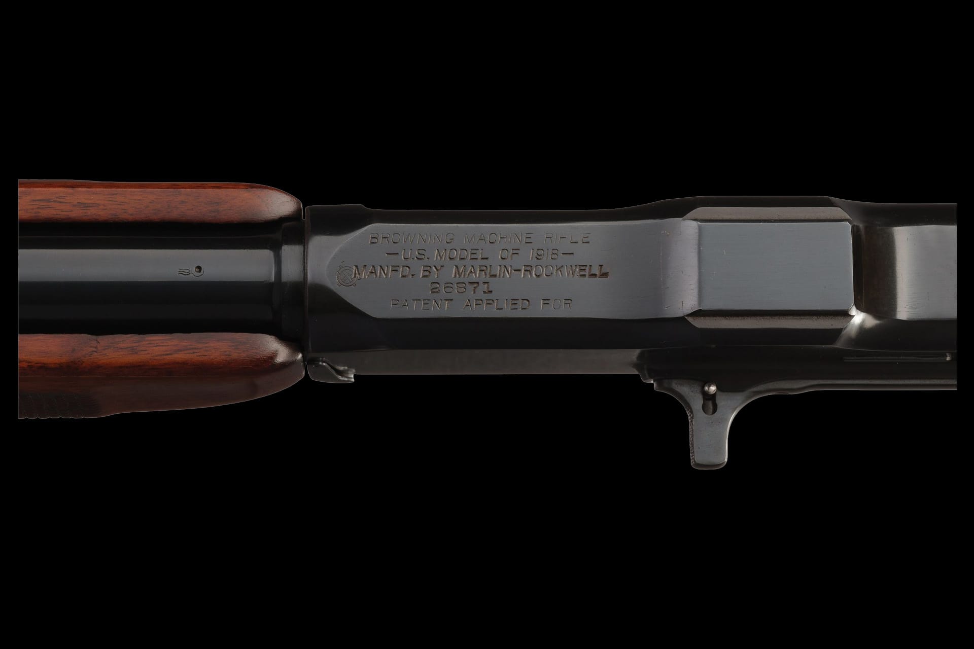 A licensed variant of the famed Browning Automatic Rifle, the 1918 Browning Machine Rifle was Marlin-Rockwell’s light machine gun contribution to World War I, delivering an unprecedented blend of firepower and mobility for infantry operations. Features include a blade front sight, folding ladder rear sight, an “M/11-18” marked barrel, and five-line nomenclature with “PATENT APPLIED FOR” markings on top of the receiver. The three-position selector is marked “F A S” (semi/full/safe) with a spring-loaded plunger between the full-auto and safe settings. Fitted with a checkered forearm and smooth pistol grip stock. Accompanied by four additional magazines.