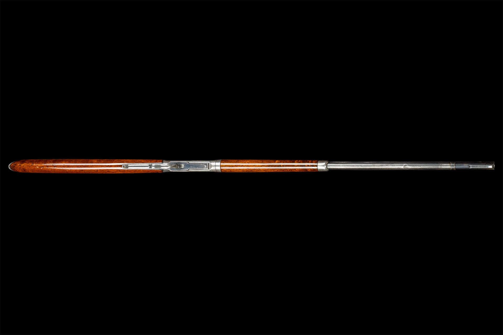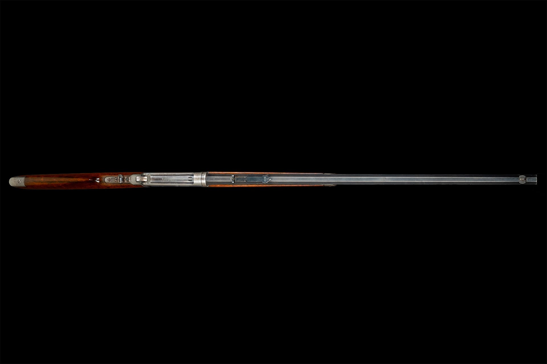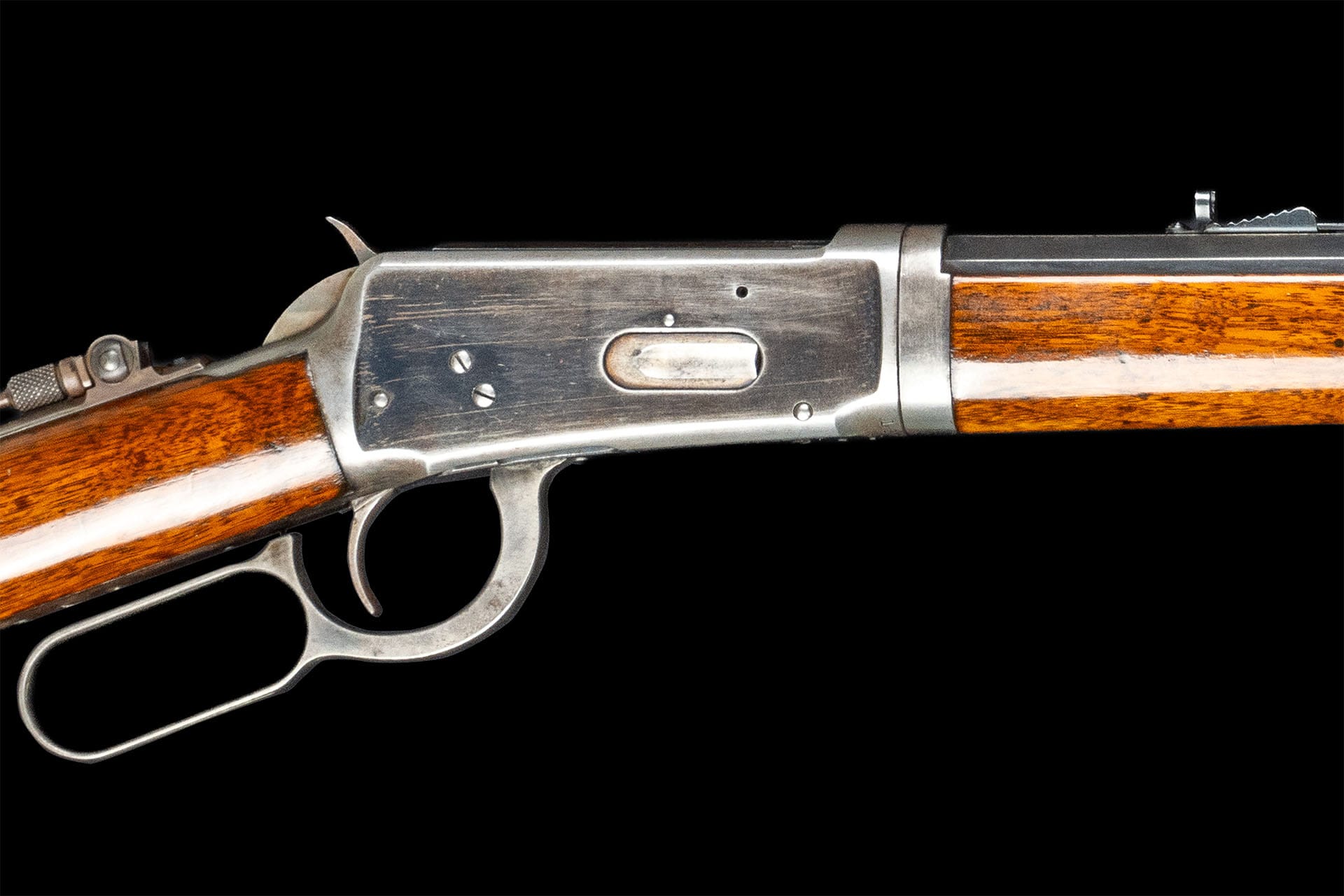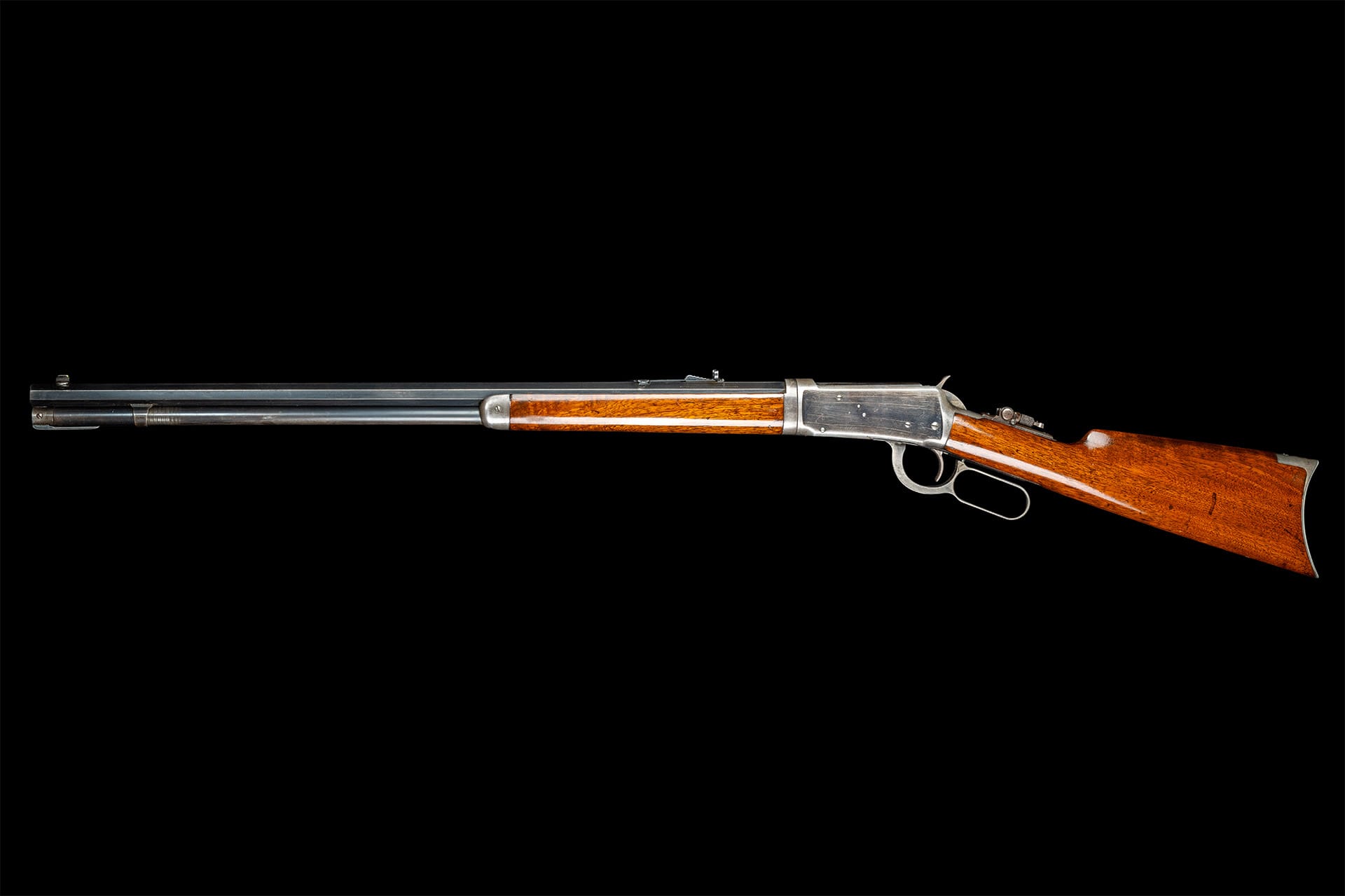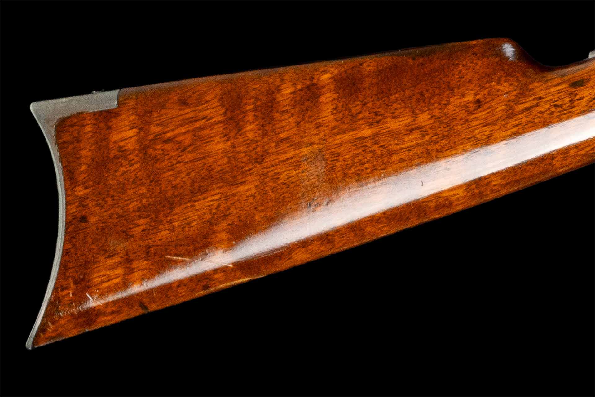 Very fine, retains 70% plus of the original blue finish, faint original case colors on the lever and hammer, and 60% of the original nitre blue on the loading gate, with some light flaking around the takedown collar and faint thinning on the receiver. The wood is fine with some scattered minor dings and scratches. Mechanically excellent.