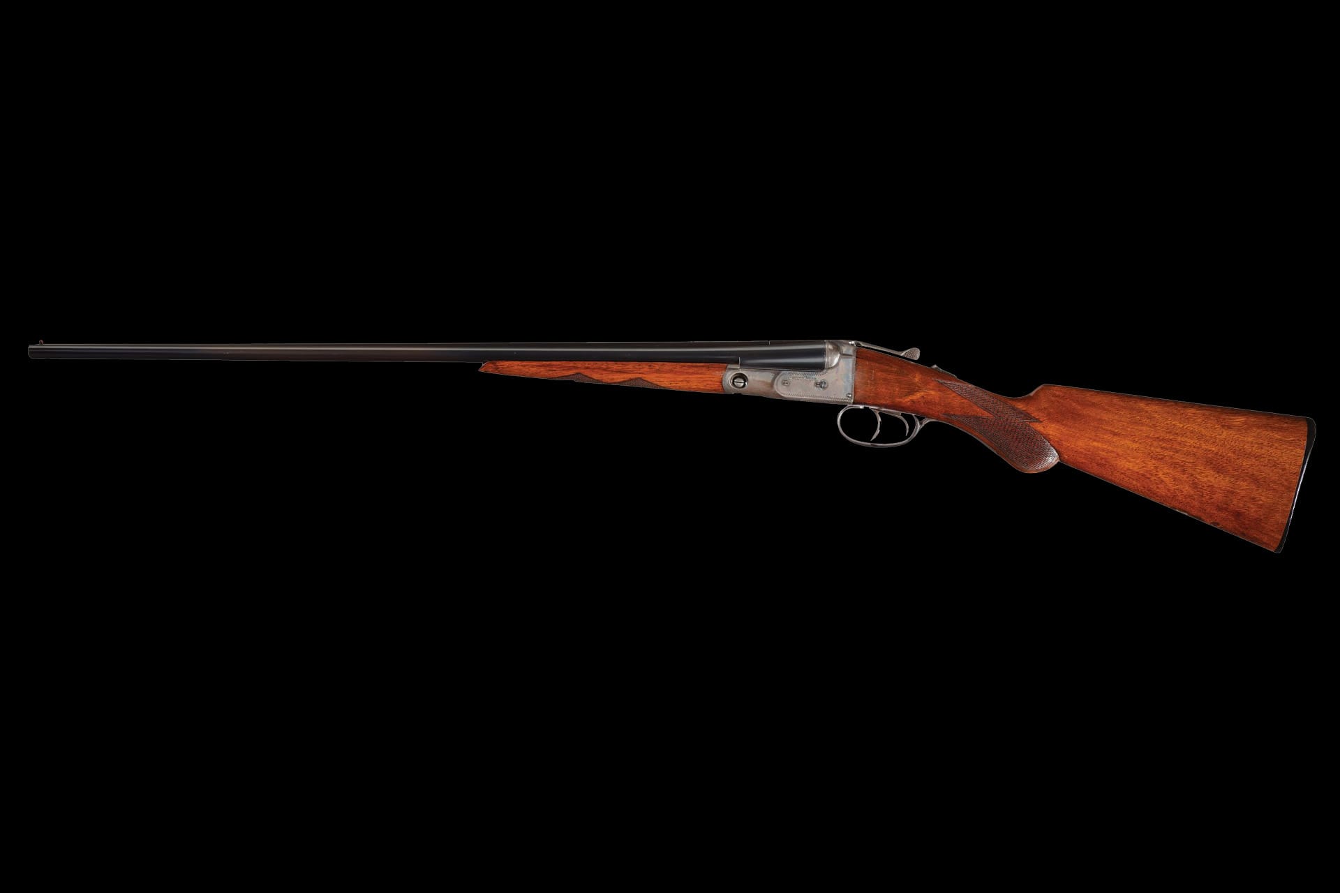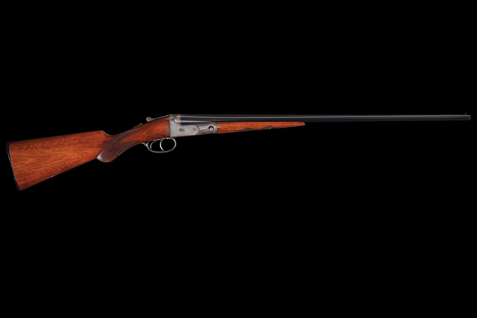 Very fine overall, retaining 98% original blue finish on the barrels, original blue on the inside of the triggerguard with the balance a grey/brown patina, and 60% original case colors with the balance a fine silver patina speckled with brown. The metal shows some minor handling evidence, a few scratches at the muzzle, and some very minor freckling. The wood shows some scratches, light pressure marks, and mostly crisp checkering. Mechanically excellent. A great chance to own one of these rare American small bore shotguns!