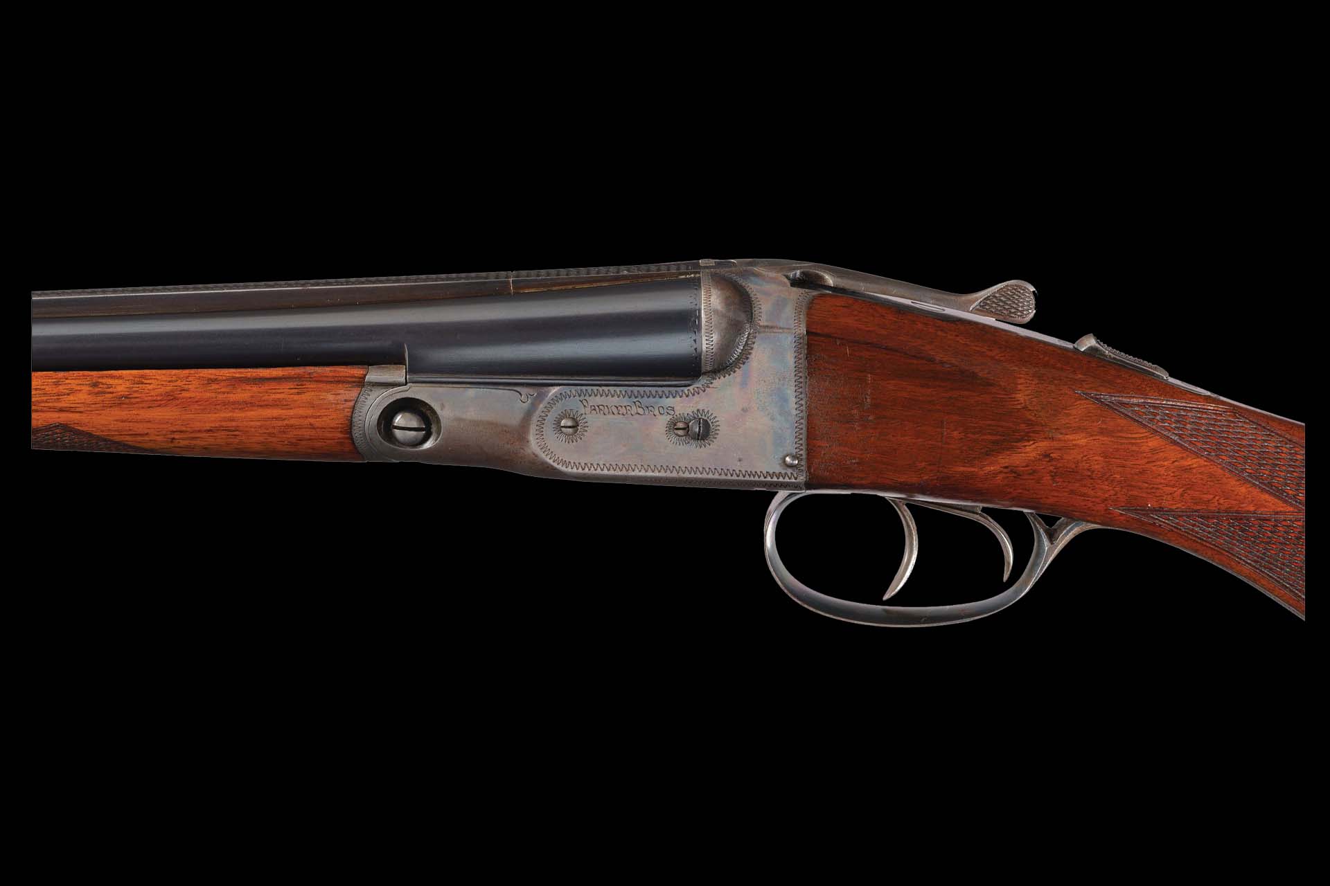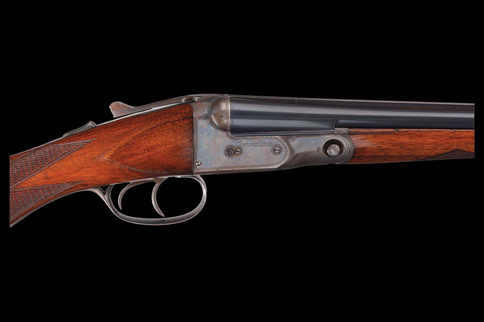 The gun is stocked with a lightly figured, multi-point checkered splinter forend and a round knob pistol grip stock fitted with a blank silver inscription shield and Parker dog’s head buttplate. The grade, gauge, barrel length, stock type, and ejectors are all confirmed on page 585 of Parker Gun Identification & Serialization by Price and Fjestad.