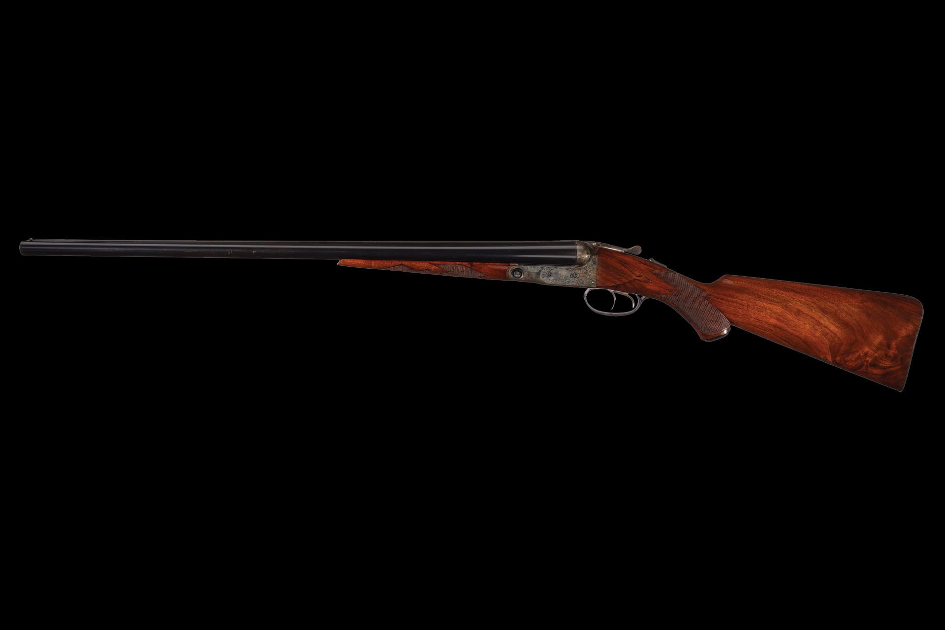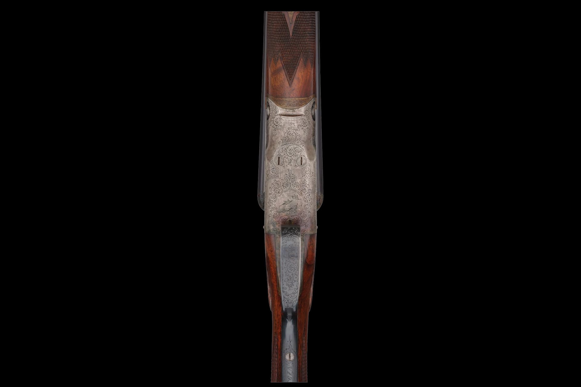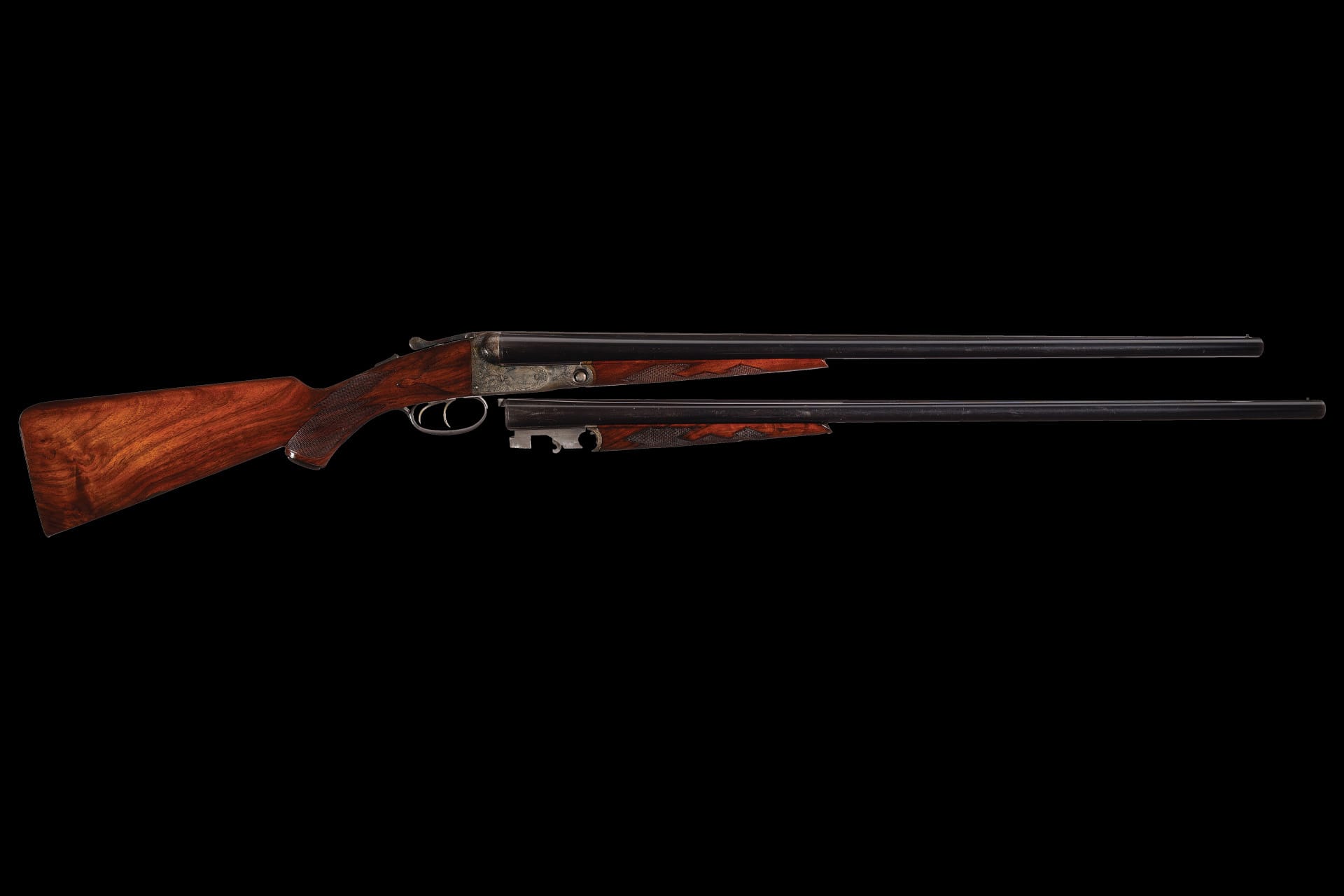The stock set consists of an attractively figured, multi-point checkered splinter forend with engraved fittings and a pistol grip stock with carved flats, factory hard rubber grip cap, blank silver inscription oval, and engraved skeleton buttplate over a checkered butt. Included is a second matching-numbered 20-gauge barrel set measuring 28 inches with 2 5/8-inch chambers and its own splinter forend.