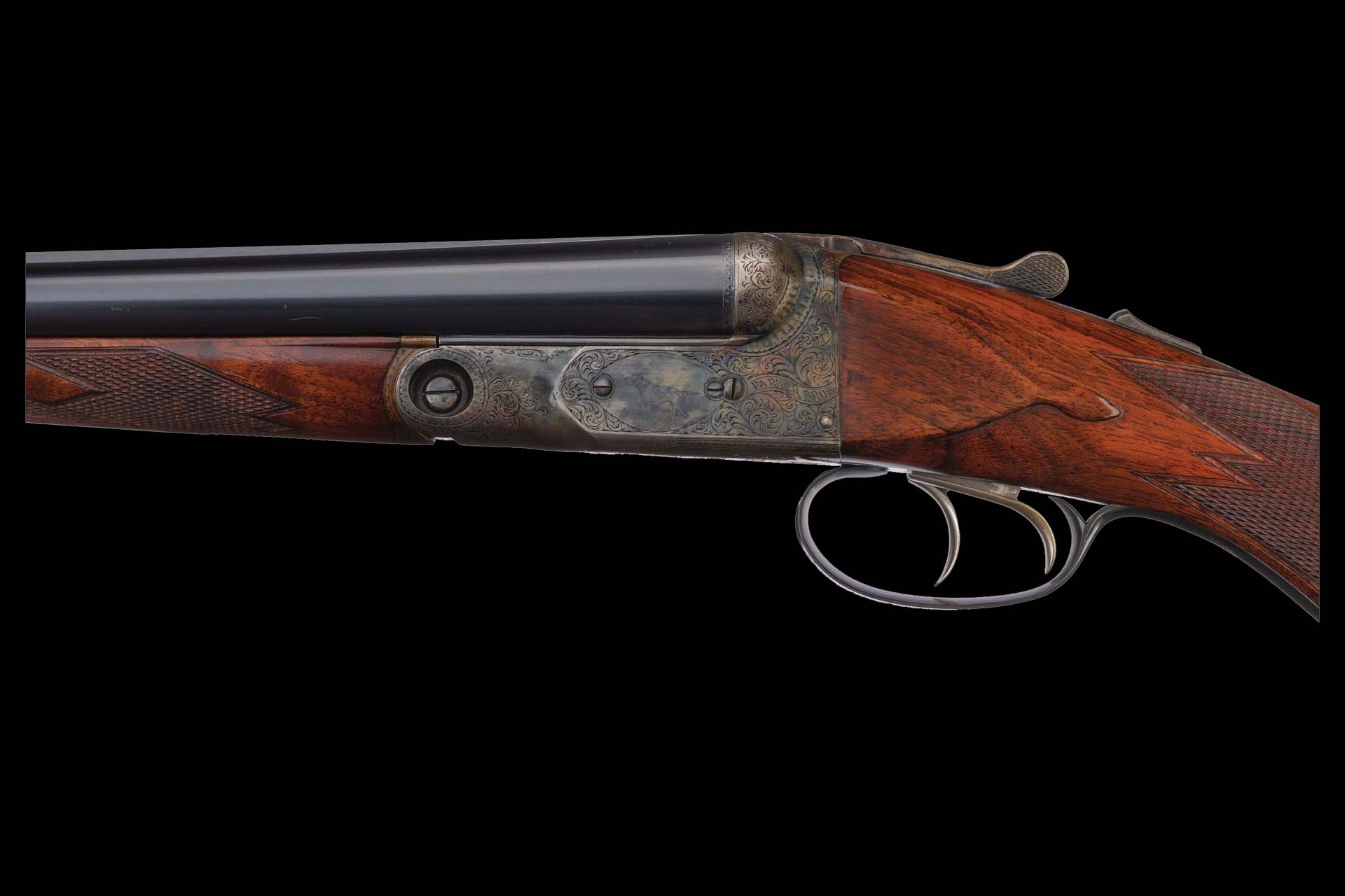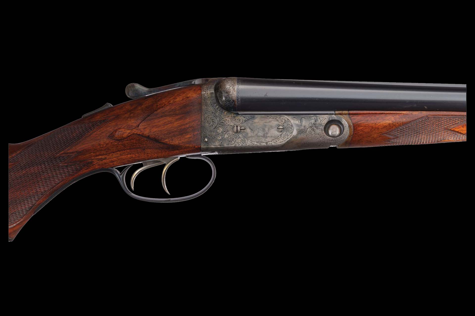 Very fine overall as professionally refurbished, retaining 98% blue finish, 70% casehardened finish with some muting and fading, some minor oxidation at the breech, recut engraving, some light dings and scratches, and sharp checkering on the wood. 28 inch barrel forend remains original with a small chip on the left side. Mechanically excellent.