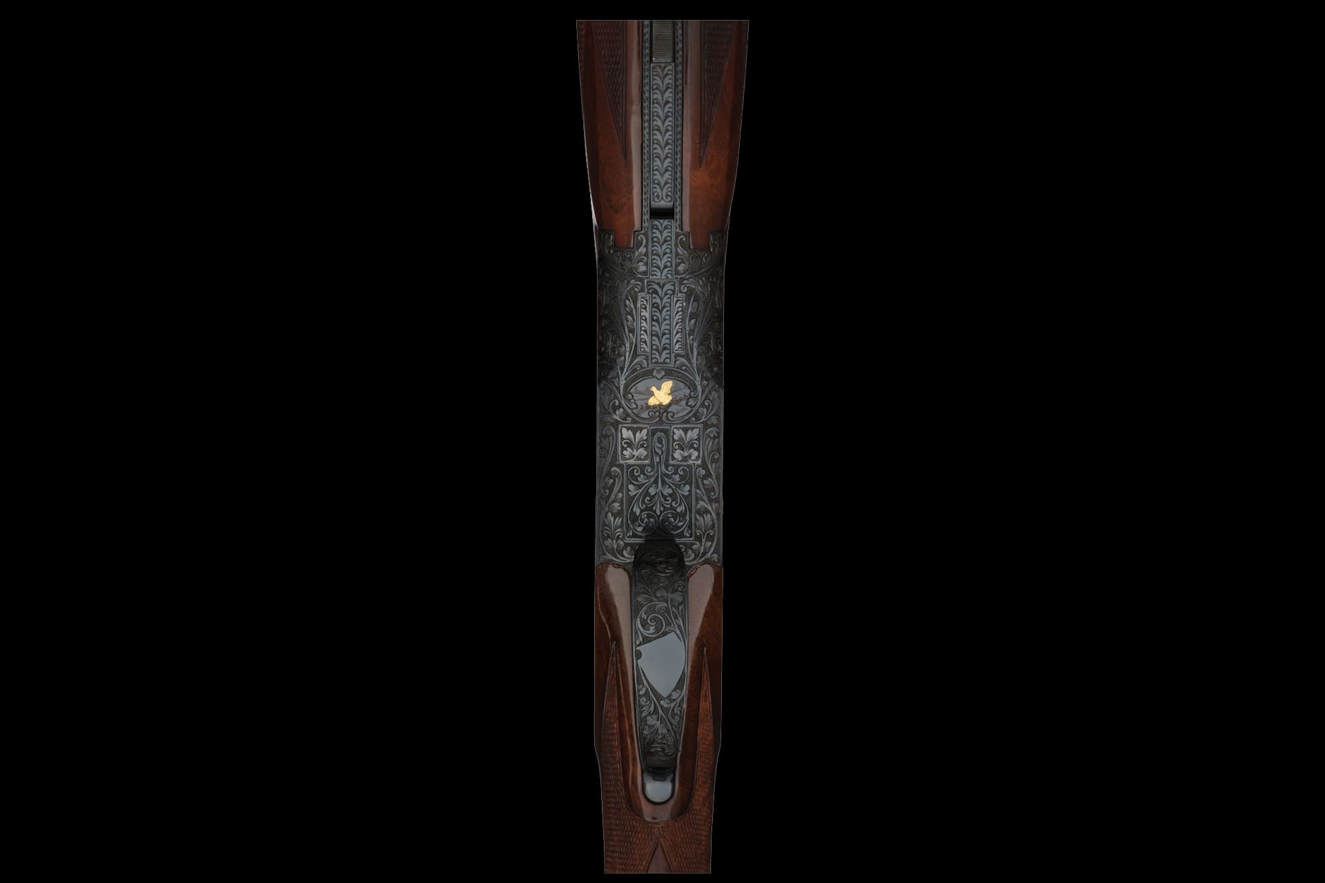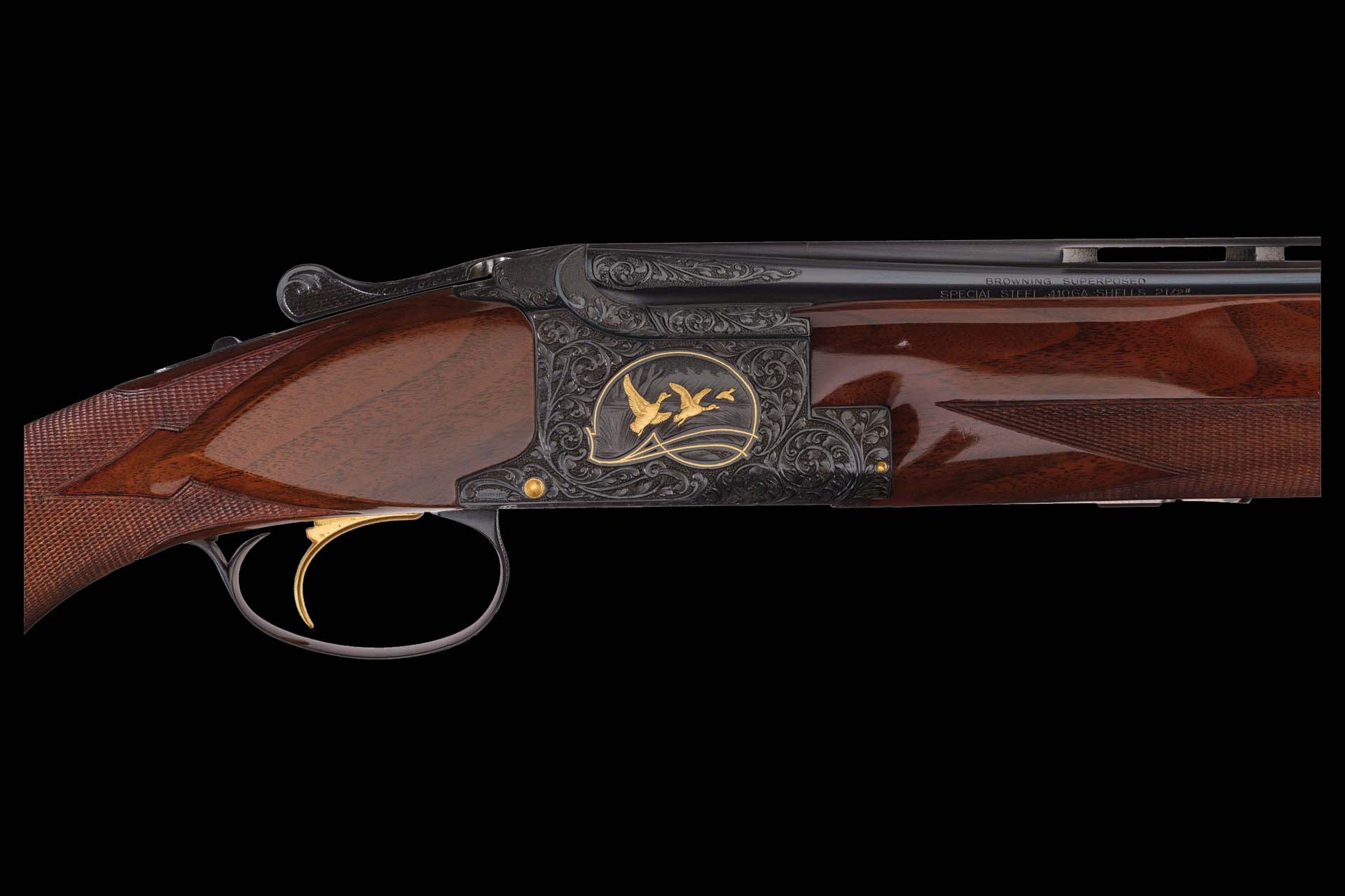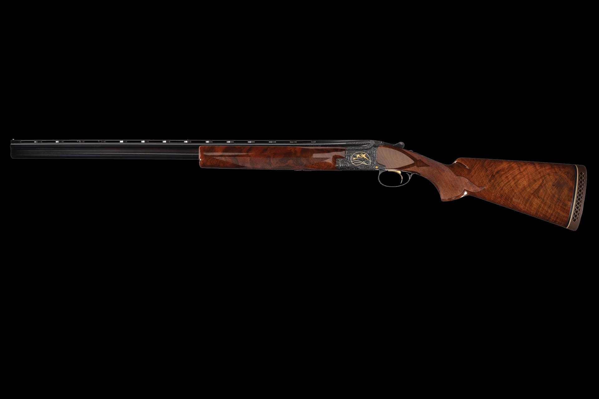 Additional features include a single gold trigger, tang-mounted safety/selector with gold-inlaid “O,” “U,” and “S” indicators, and a beautifully figured, fancy multi-point checkered beavertail forend with engraved forend iron. The stock is a flat knob short tang pistol grip configuration, fitted with a Browning recoil pad.