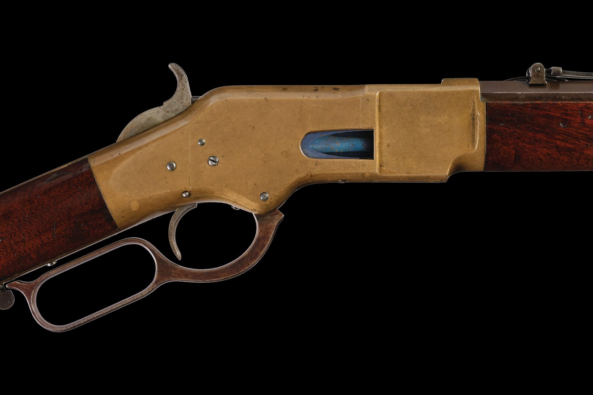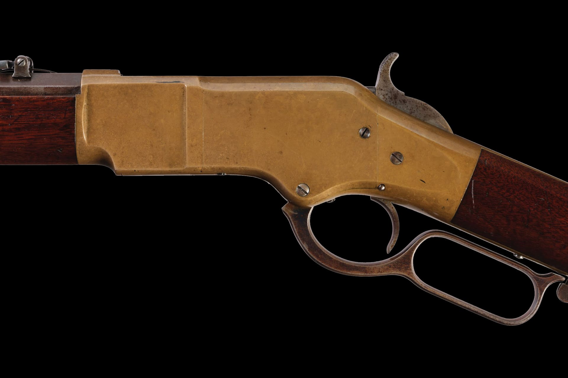 Exceptionally fine. The blue finish on the barrel and magazine has faded to a plum brown patina. The barrel has some light edge wear and some scattered patches of surface discoloration. The loading gate retains most of the niter blue finish. The hammer and lever have a silver-gray patina with traces of the original casehardened finish. The exceptionally fine forearm cap, frame, and crescent buttplate have a very attractive, deep, un-touched dark, attractive patina. The side plate joints are tight. The barrel markings and serial number are sharp. The stock and forearm are both fine with moderate handling wear and most of the original varnish. Handling wear is limited to a few very minor dents and scratches. The loading gate is jammed, but the action functions. This is an exceptionally fine, original example of a Winchester Model 1866 lever action rifle.